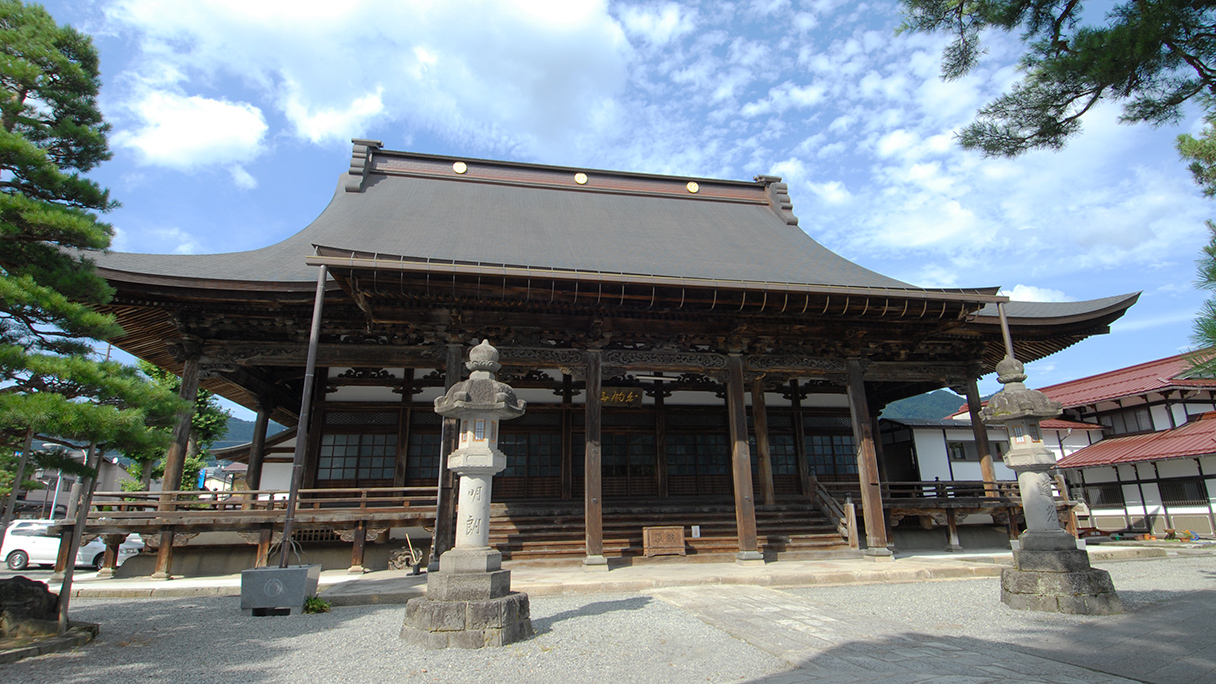 - 浄土真宗、西本願寺派のお寺。毎年1月15日に親鸞聖人の命日を偲んで行われる飛騨古川の「三寺まいり」の時に巡拝する3つのお寺の1つです。天文元年(1532)開基、総ヒノキ造りの本堂と鐘楼は飛騨有数と称され、山門は名工・山脇八尋氏が手がけたもの。また、本光寺の本堂は、木造建築では飛騨地域で最も大きく、堂々たる存在感を放っています。敷地内には、その昔、製糸業の盛んな信州に出稼ぎに行ったという飛騨の若い女工たちの姿を描いた小説『あゝ野麦峠』を記念した文学碑も建てられています。