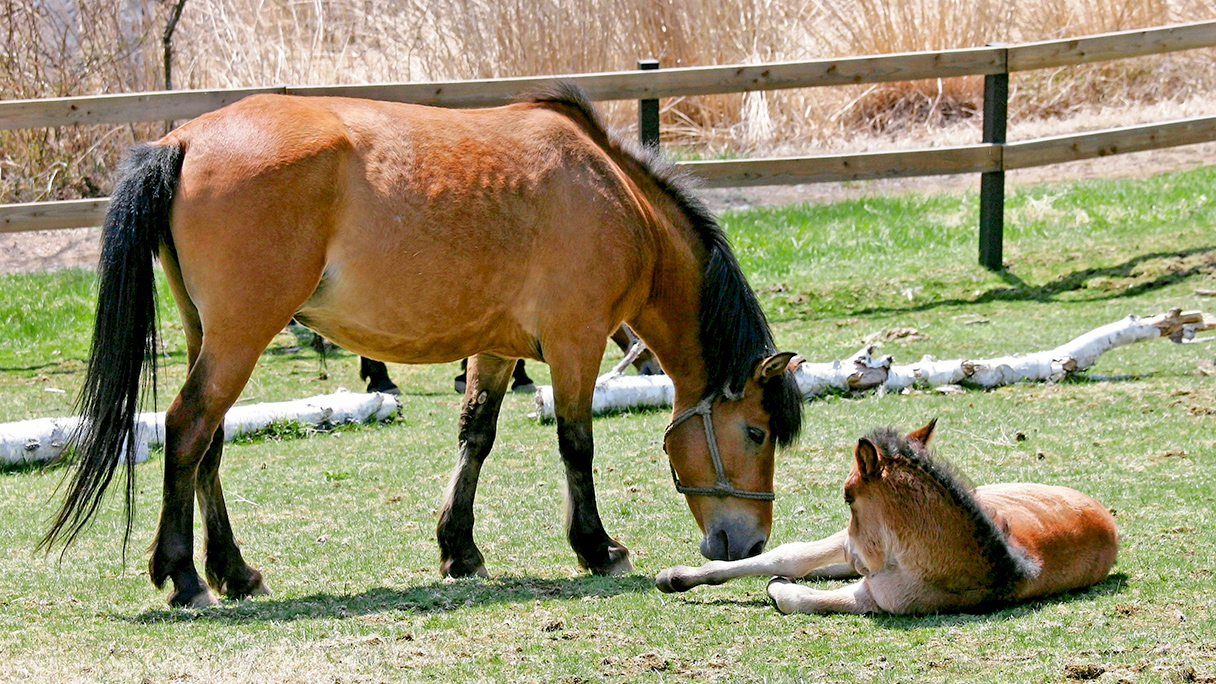 爽やかな高原で日本在来馬「木曽馬」と触れ合う
