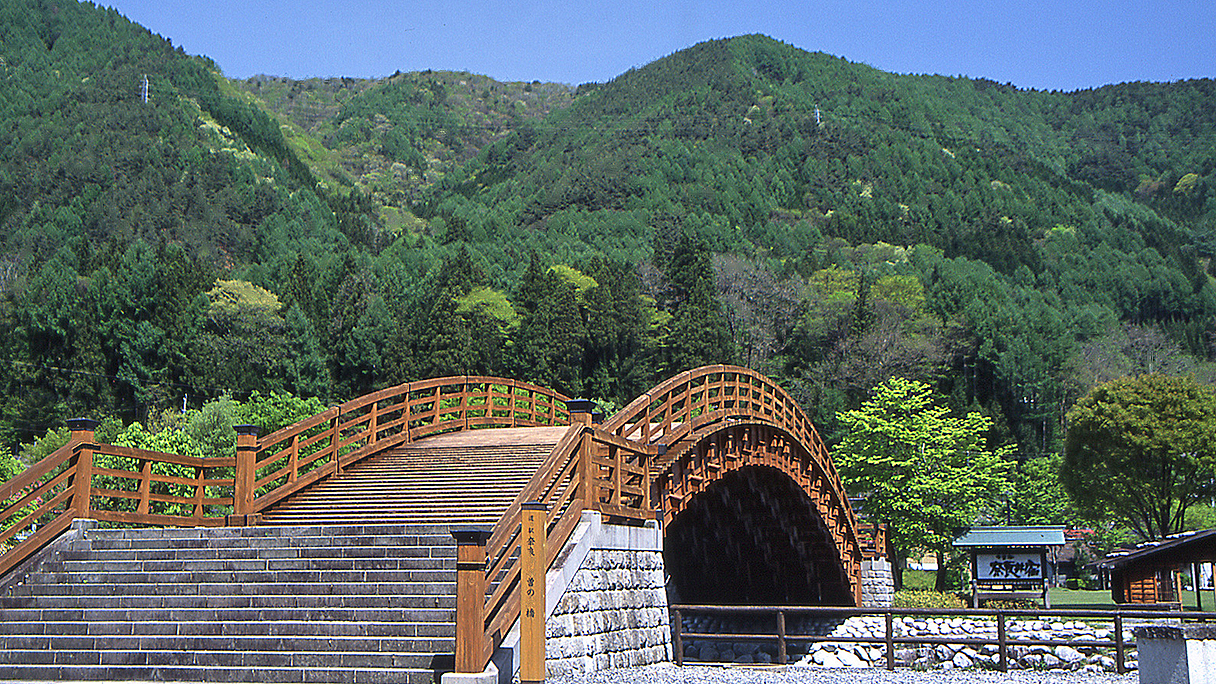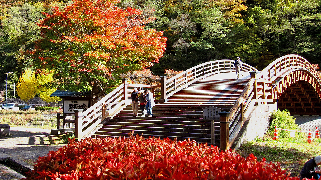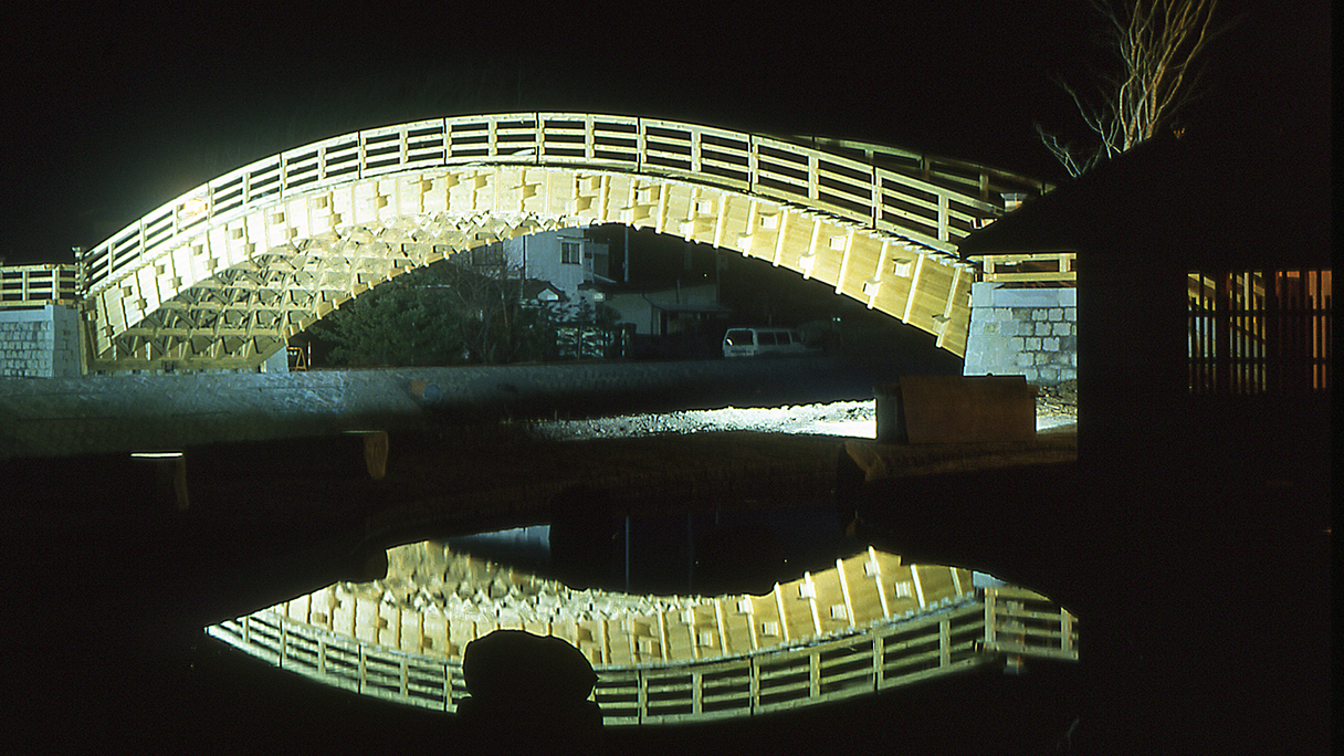 ライトアップが美しい、総ヒノキづくりの太鼓橋